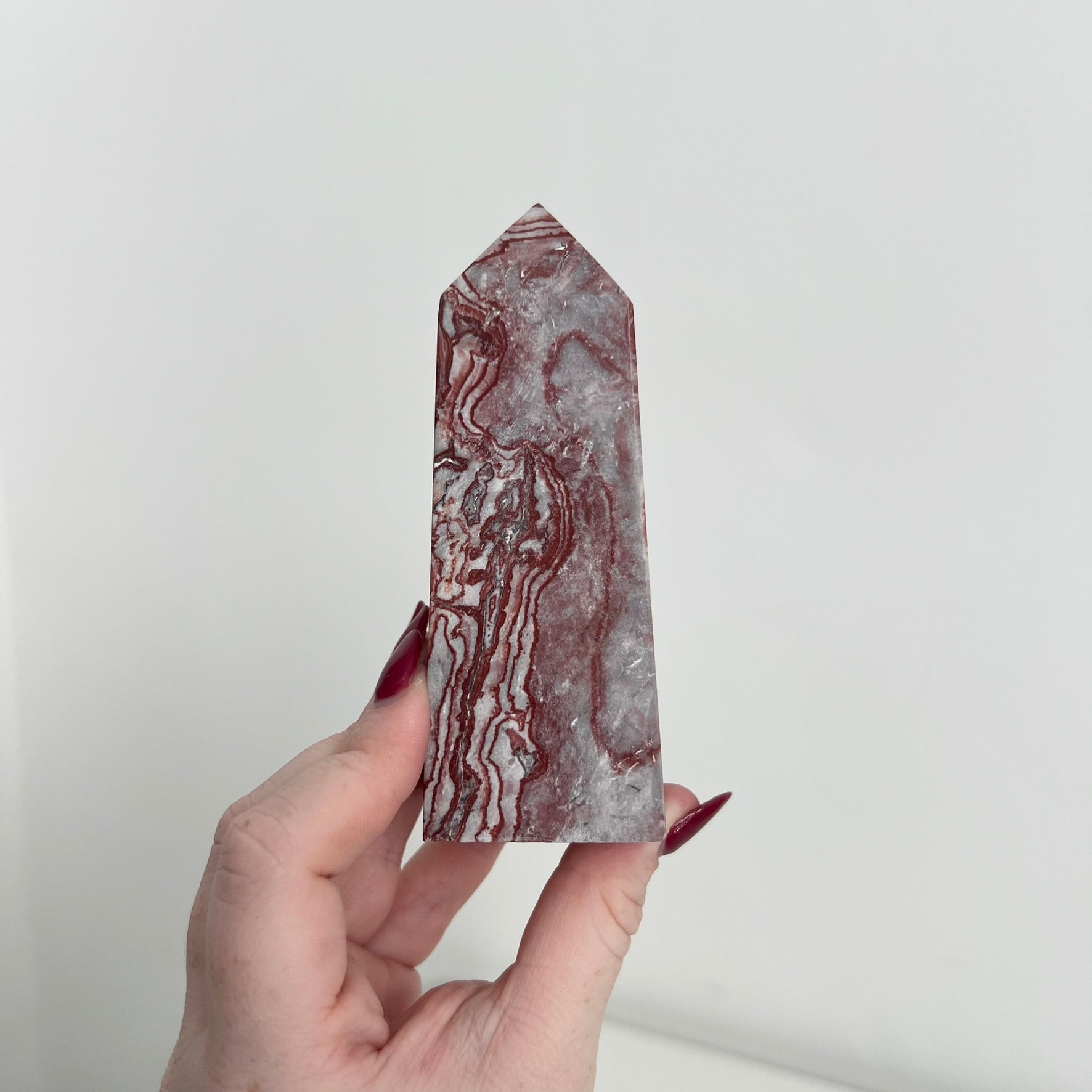 Beautifully patterned towers showcasing swirling bands of cream, grey, and earthy reds. Often called the "laughter stone," this variety of agate is prized for its intricate designs and uplifting appearance—perfect for display, collections, or meditation spaces.