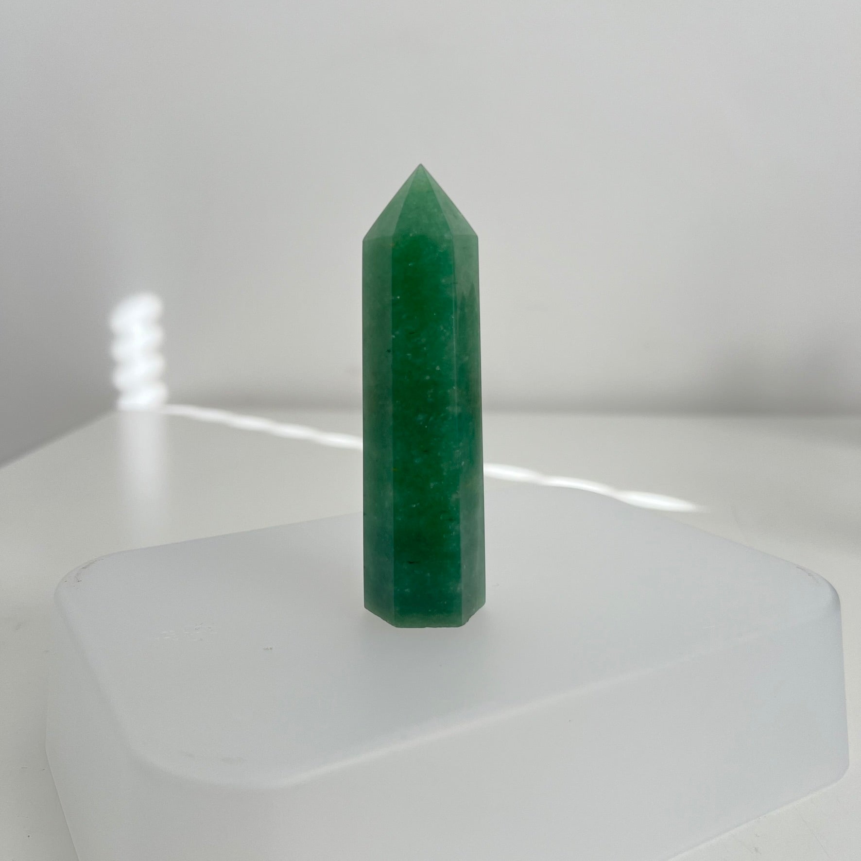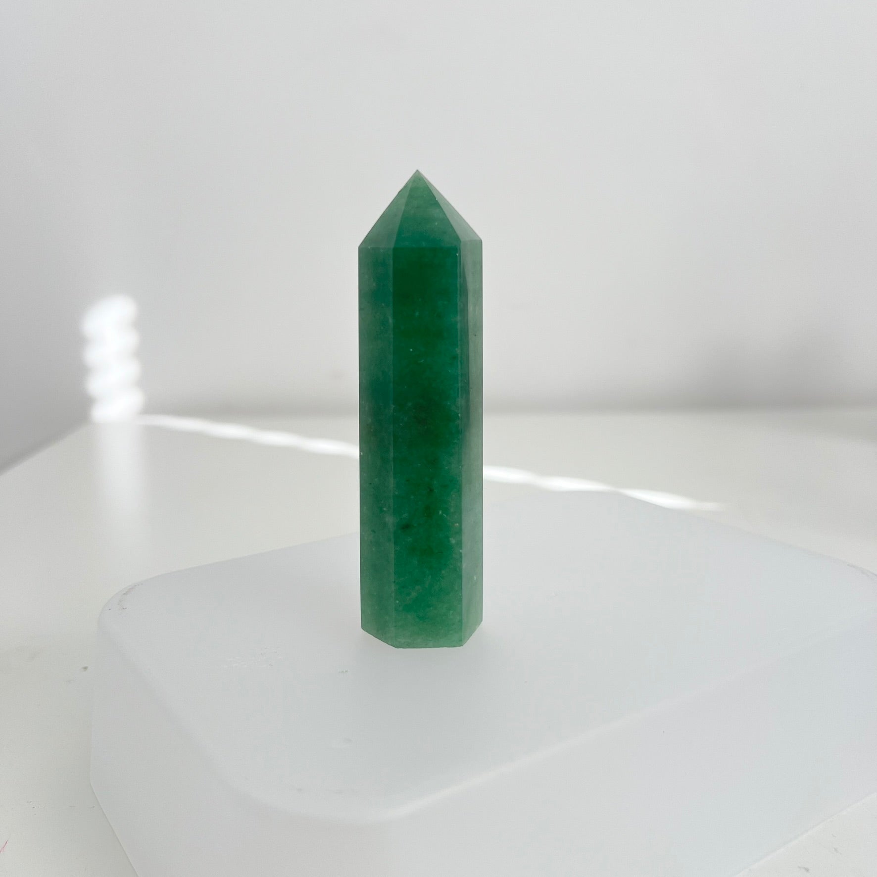 Polished towers in a rich green hue, known for their subtle shimmer and natural beauty. Each piece is unique, making a calming and elegant addition to any collection, décor, or meditation space.