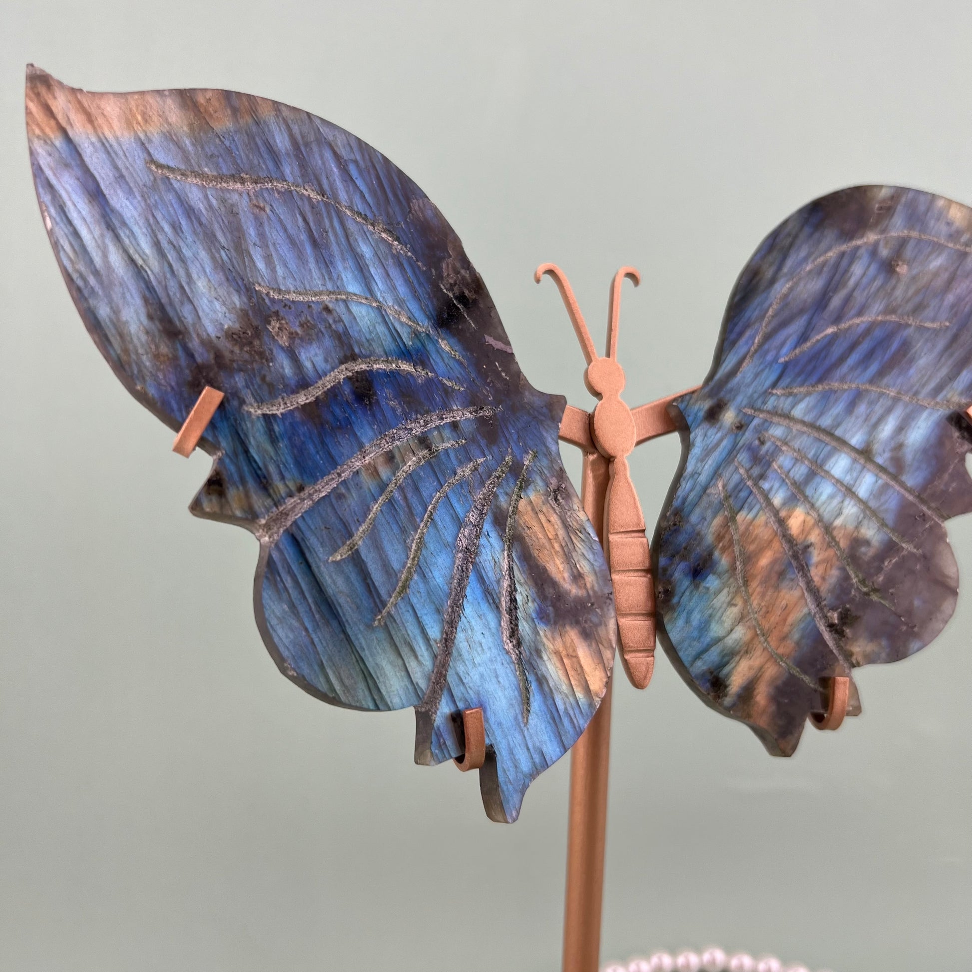 This captivating labradorite displays a play of color known as labradorescence, with flashes of blue, green, and gold emerging as light moves across its surface. Each piece is unique, with natural variations in pattern and intensity that make it one of a kind. Polished to enhance its reflective sheen, it is both visually striking and full of character, making it a standout addition to any crystal collection or décor arrangement.