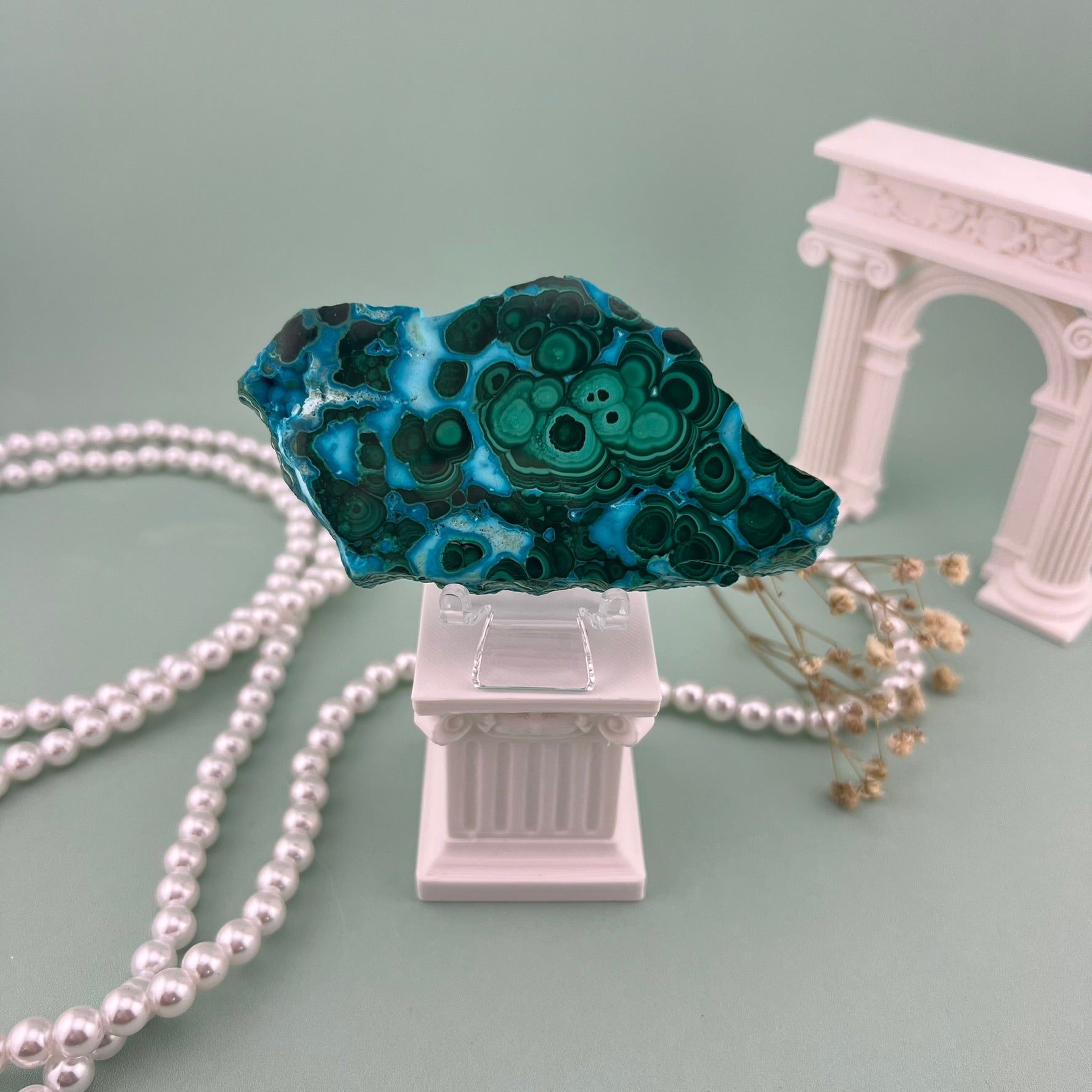 Malacholla is a stunning fusion of Malachite and Chrysocolla, known for its vibrant mix of deep greens and bright ocean blues. Each slab highlights flowing patterns and natural color shifts that feel like miniature landscapes. With its smooth finish and bold presence, Malacholla brings a unique artistic touch to décor, crystal grids, and display collections. No two pieces are ever alike, making each one a standout treasure.
