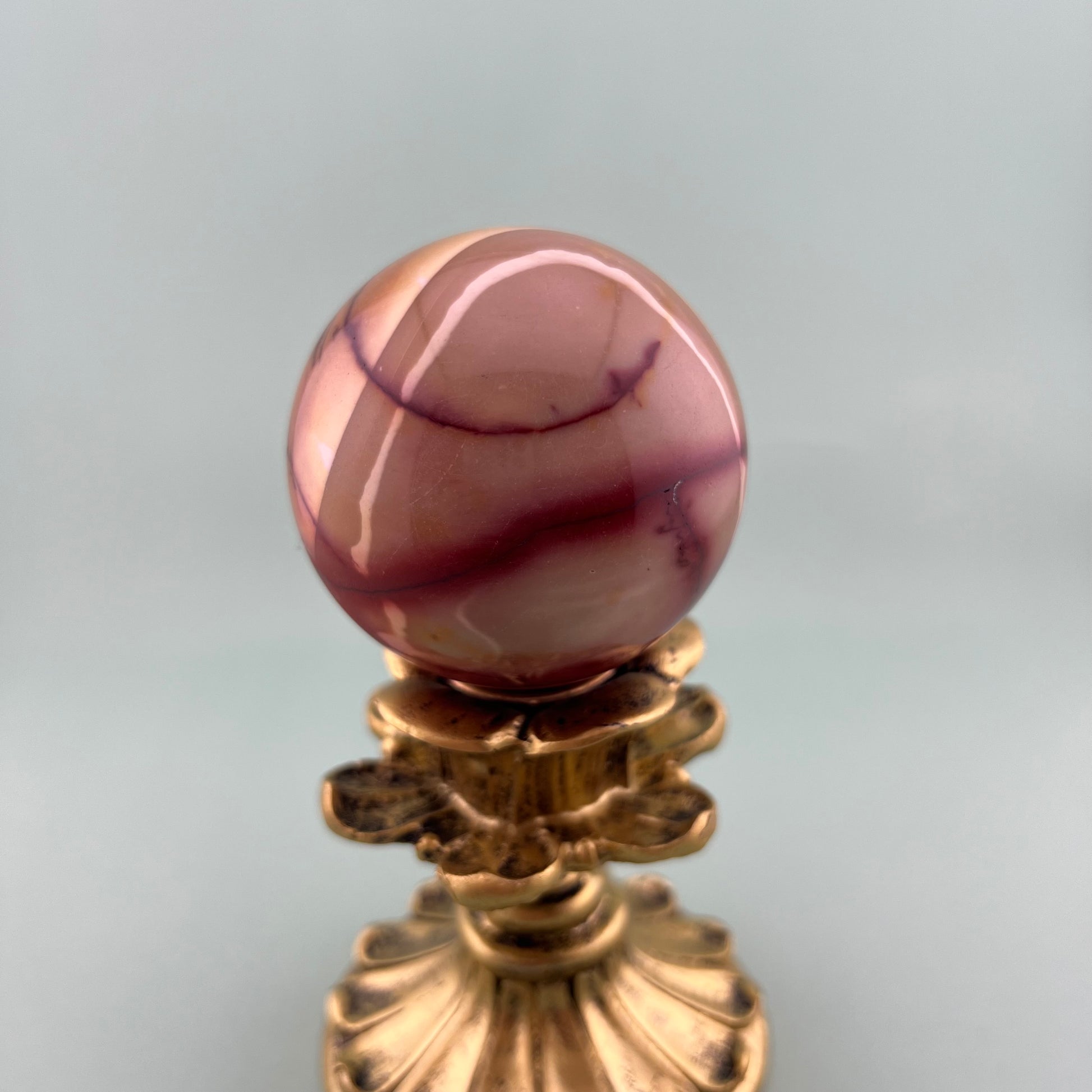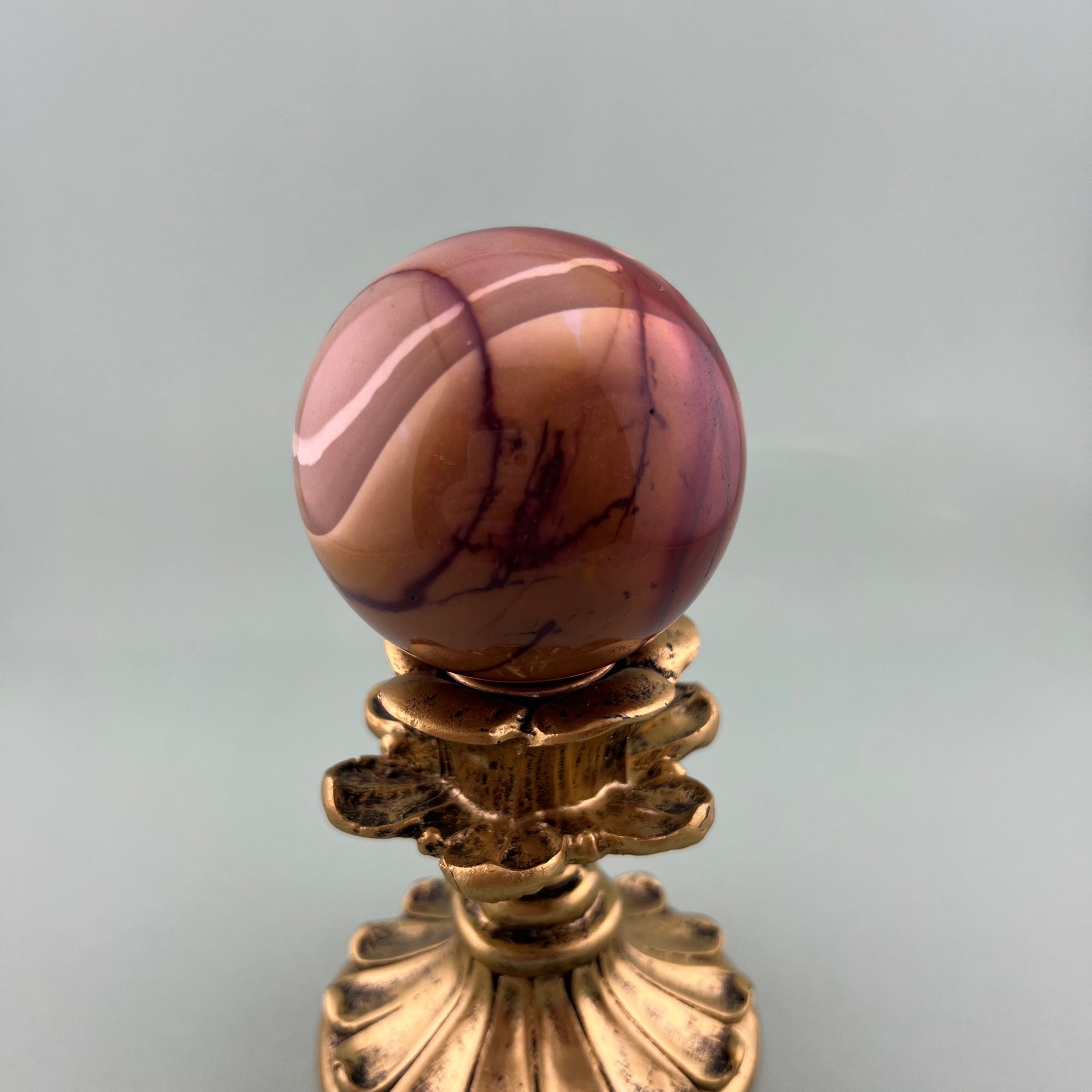 This polished mookaite jasper sphere shows rich tones of red, gold, and cream with natural flowing patterns. Mookaite is often associated with grounding and vitality, making it a beautiful and steadying addition to any crystal collection.