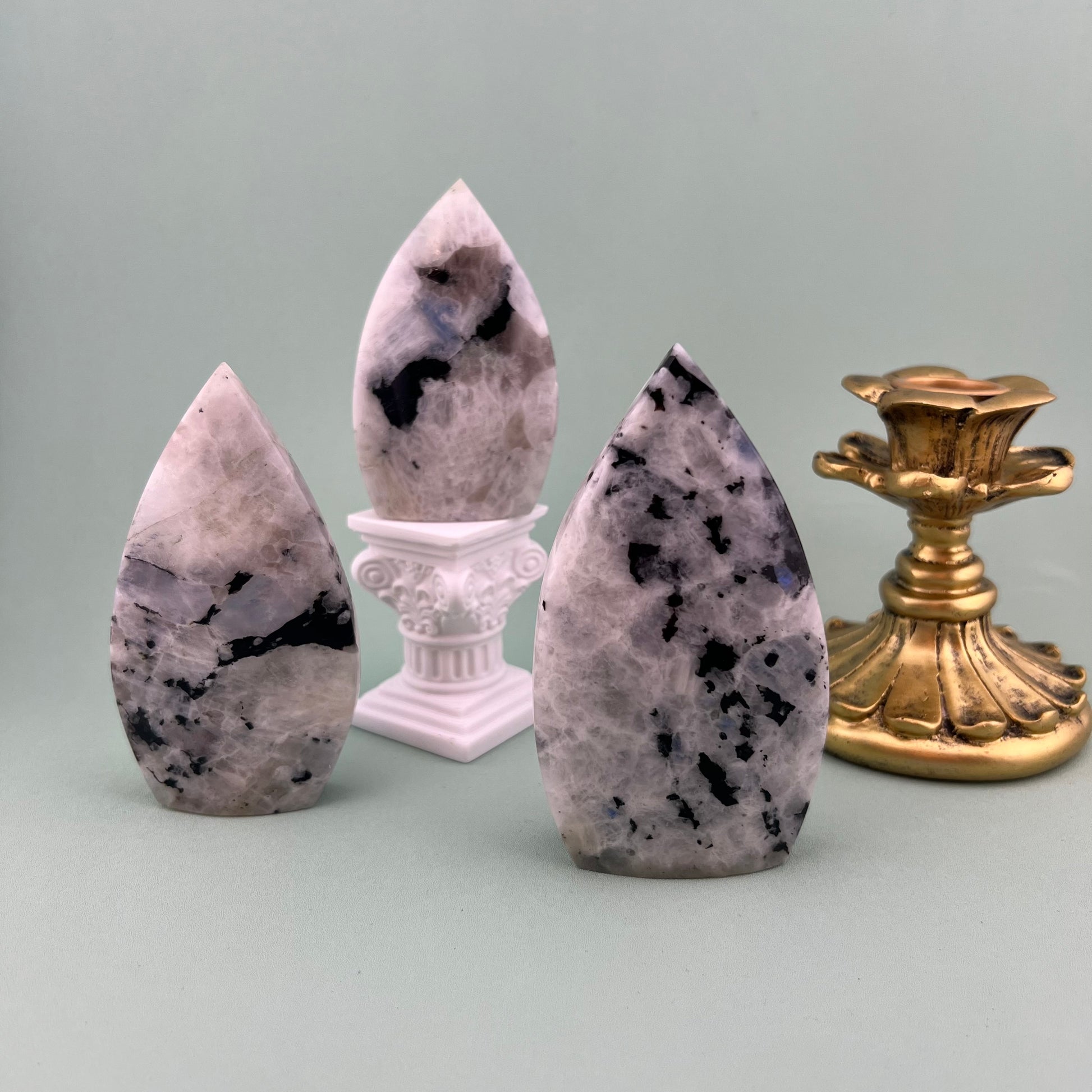 Embrace the radiant and intuitive energy of our Rainbow Moonstone freeforms. Each piece showcases unique shapes with shimmering flashes of blue and iridescent light. Rainbow Moonstone is believed to support emotional balance, enhance intuition, and encourage new beginnings, making it a beautiful stone for clarity and spiritual growth.