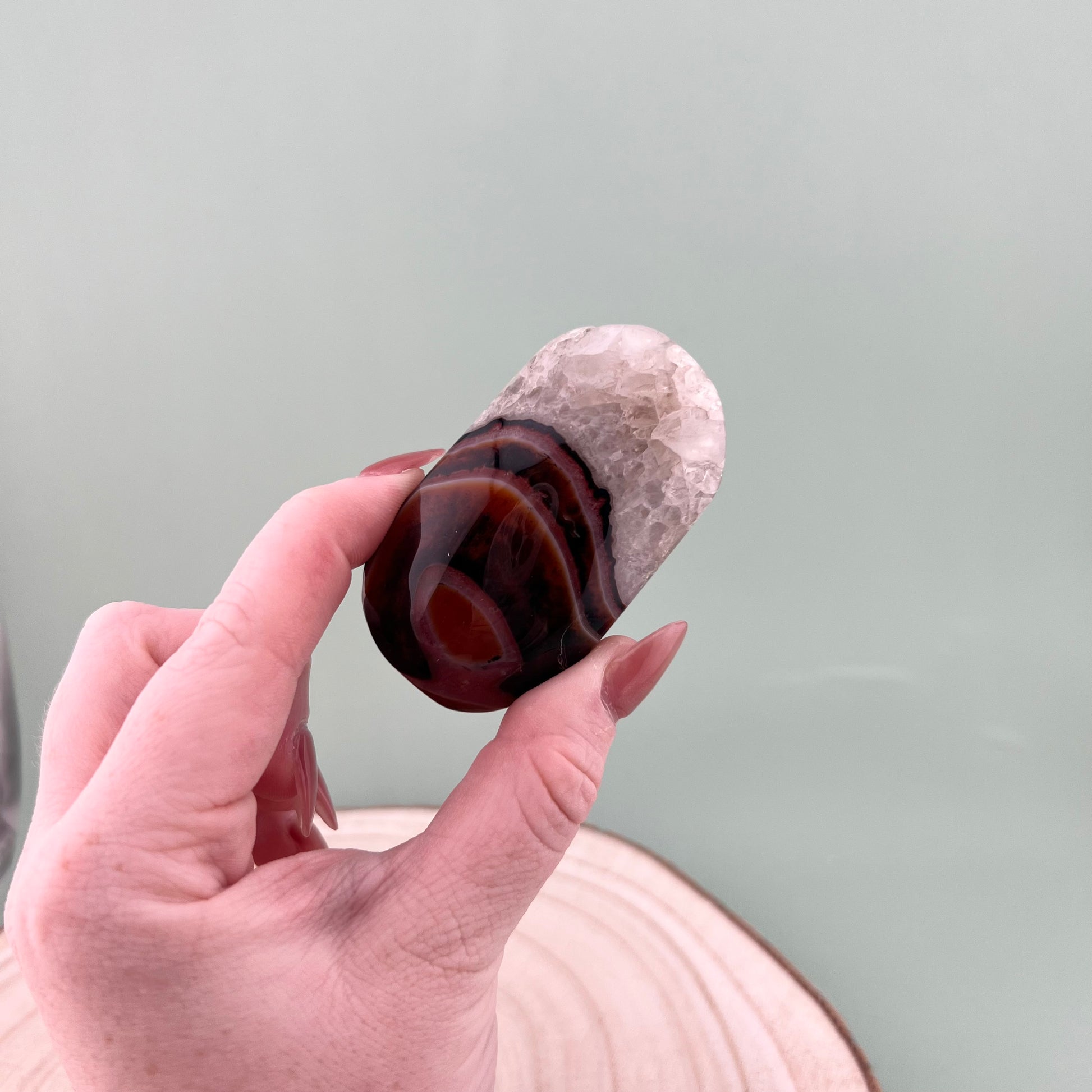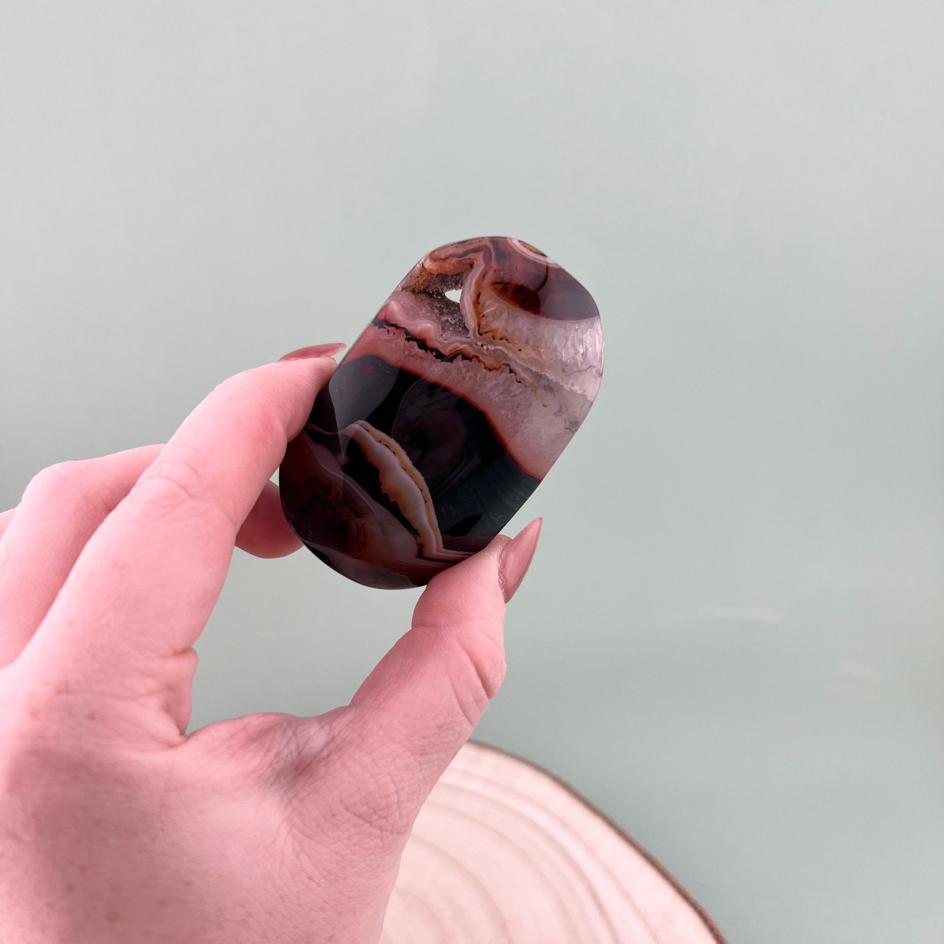Embrace the strengthening and stabilizing energy of our Sardonyx palms. With their bold bands of red, brown, and white, these stones are known for promoting confidence, protection, and grounding. Sardonyx is believed to encourage discipline, boost motivation, and support clear, steady decision-making.