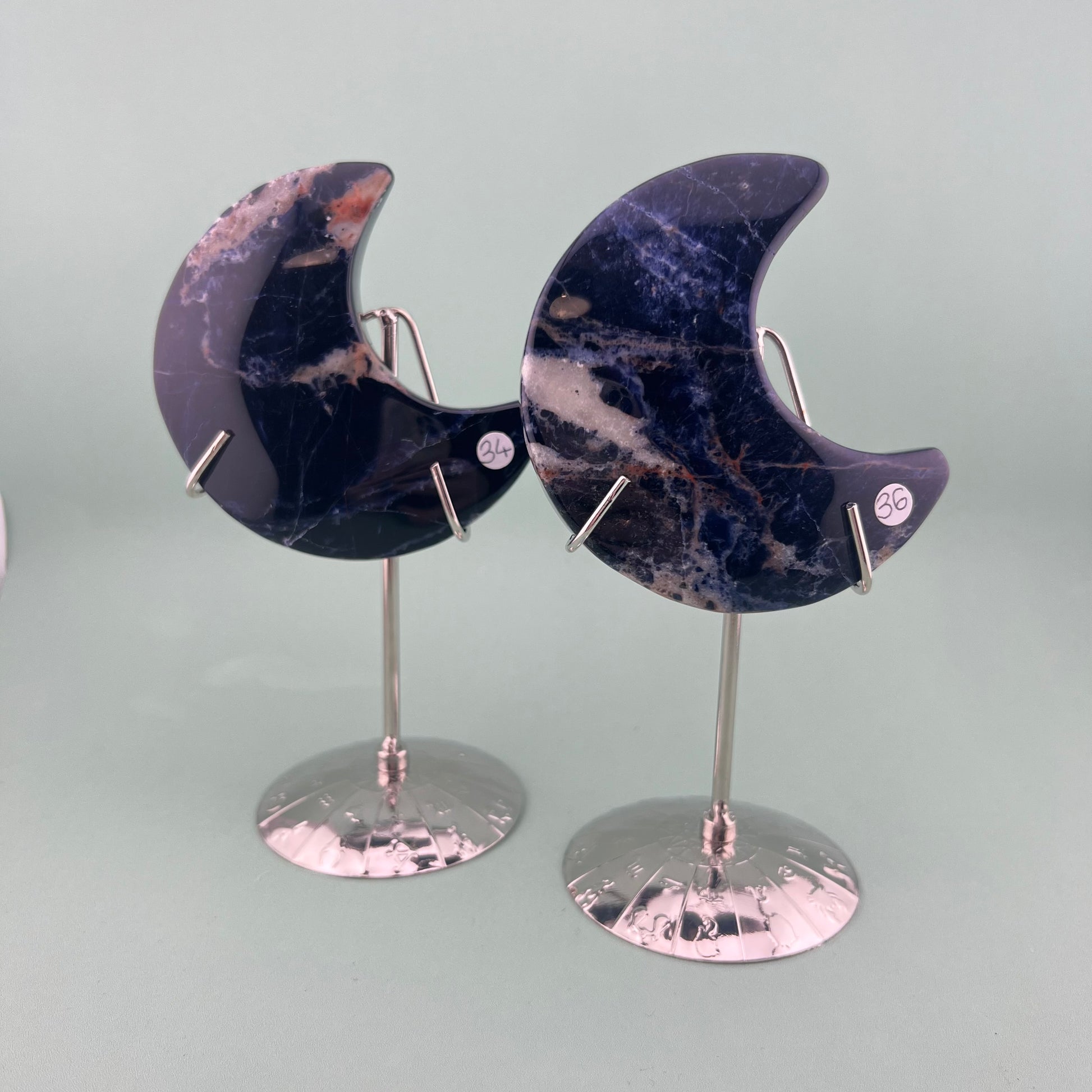 Each piece shows deep navy tones mixed with streaks of white and soft grey, creating a celestial, night-sky look. The natural marbling makes every moon completely unique, adding a calm, aesthetic touch to any crystal or décor display.