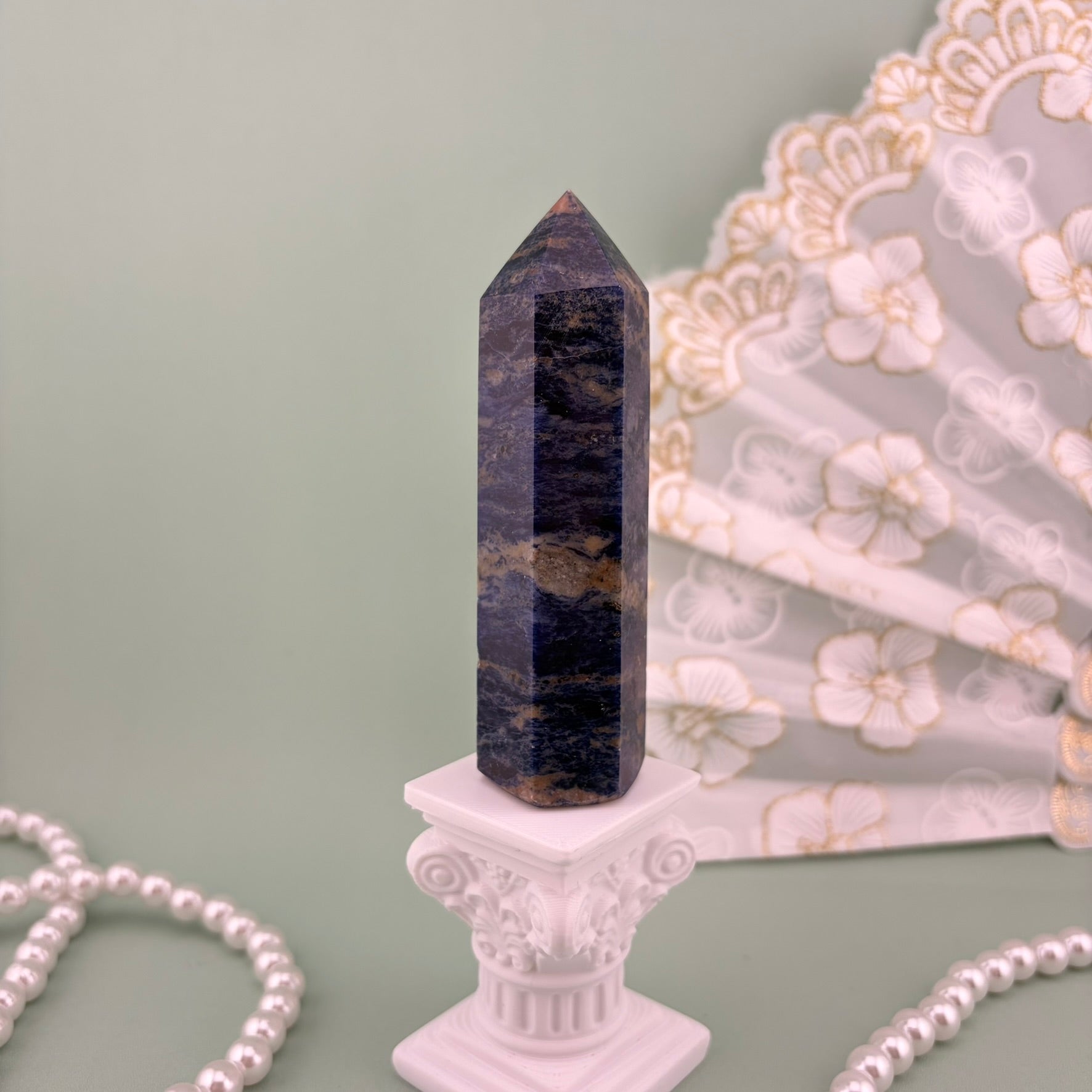 This sodalite tower features rich deep blue tones flowing through the stone with natural white and soft grey veining. A warm earthy band running through the centre adds beautiful contrast, giving the piece depth and character.