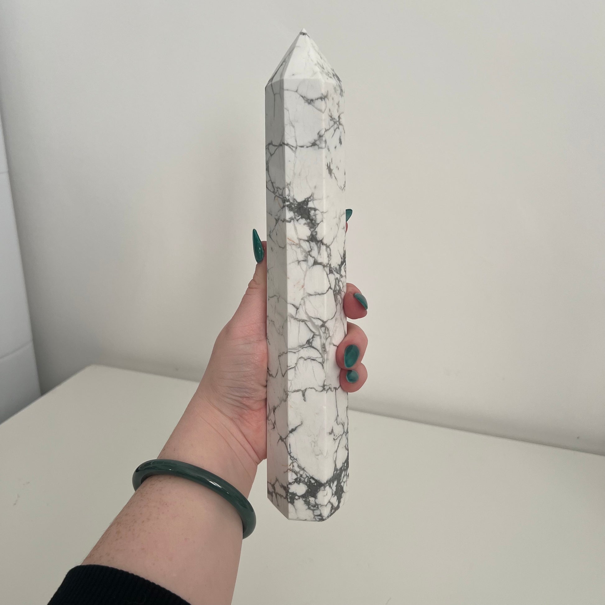 This impressive 900g piece stands at 25.5cm tall, featuring clean white tones with distinctive grey veining throughout. The tall, polished shape highlights the stone’s calming, marbled patterns, making every tower naturally unique. A beautiful, minimalist statement piece perfect for crystal collectors and modern décor lovers alike.