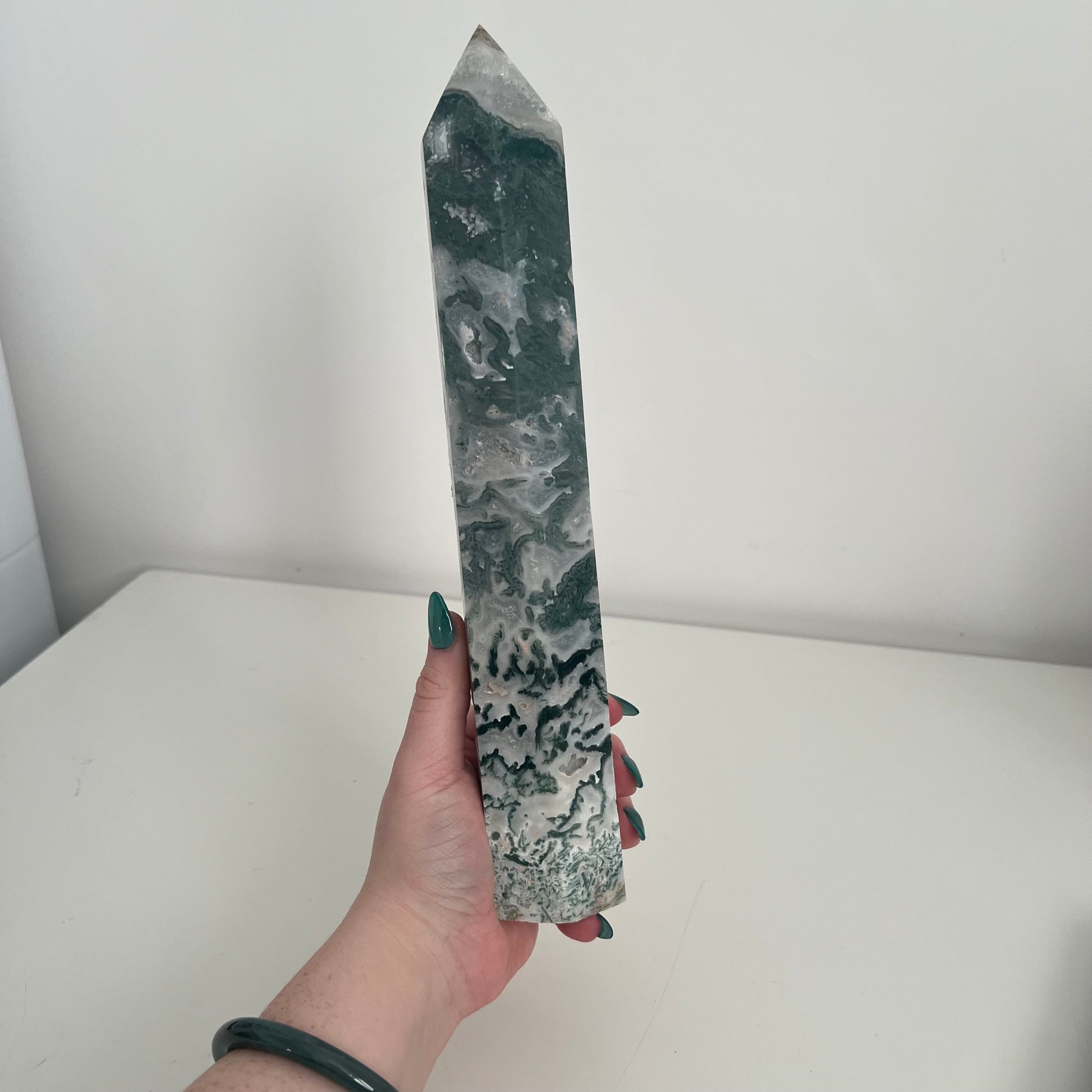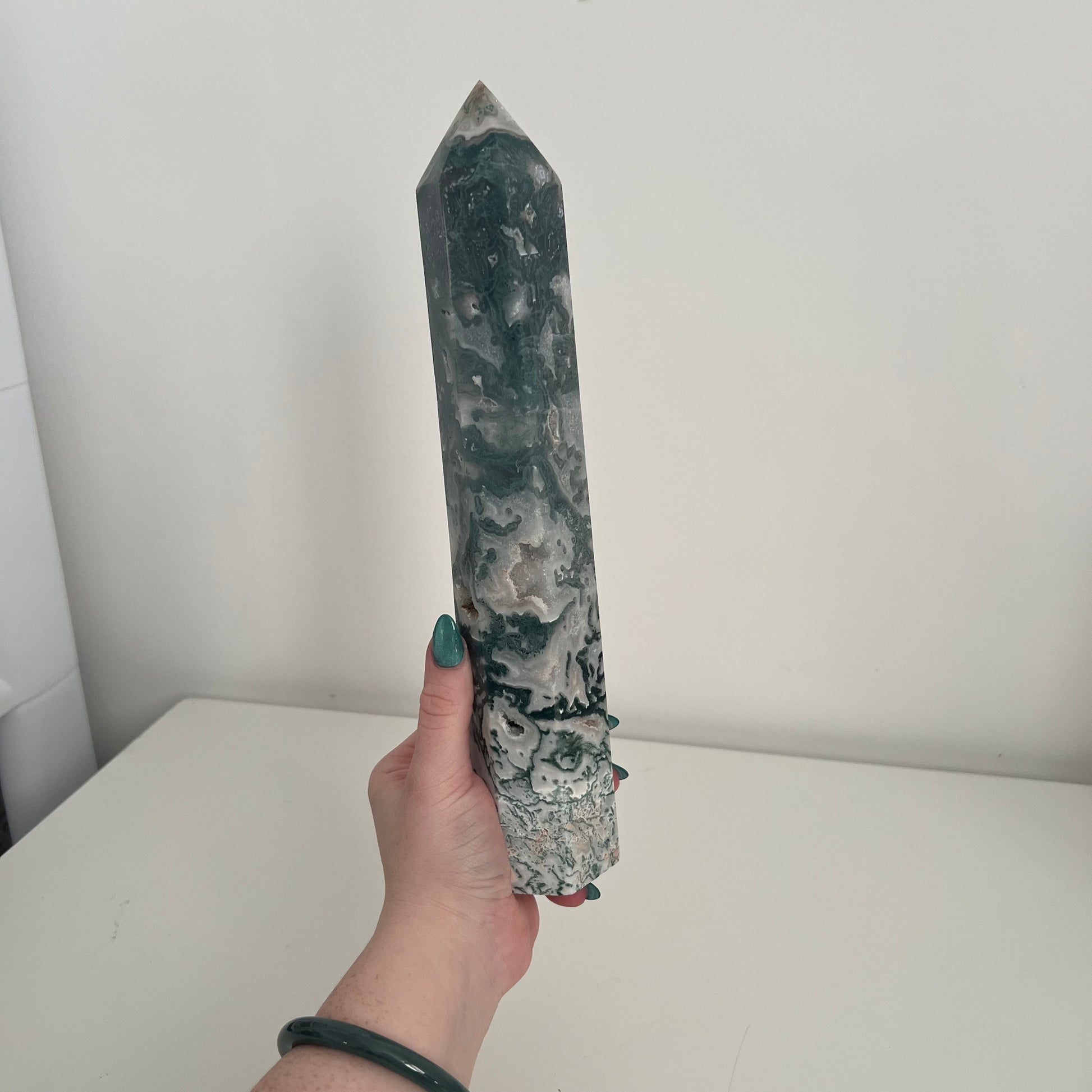 This impressive 1053g piece stands at 28cm tall, showcasing vibrant green moss-like inclusions suspended within milky white and translucent agate. The height and clarity make it a true showstopper, with intricate natural patterns that ensure this tower is completely one-of-a-kind. A bold, earthy centrepiece perfect for collectors, décor lovers, or anyone wanting a standout display piece.