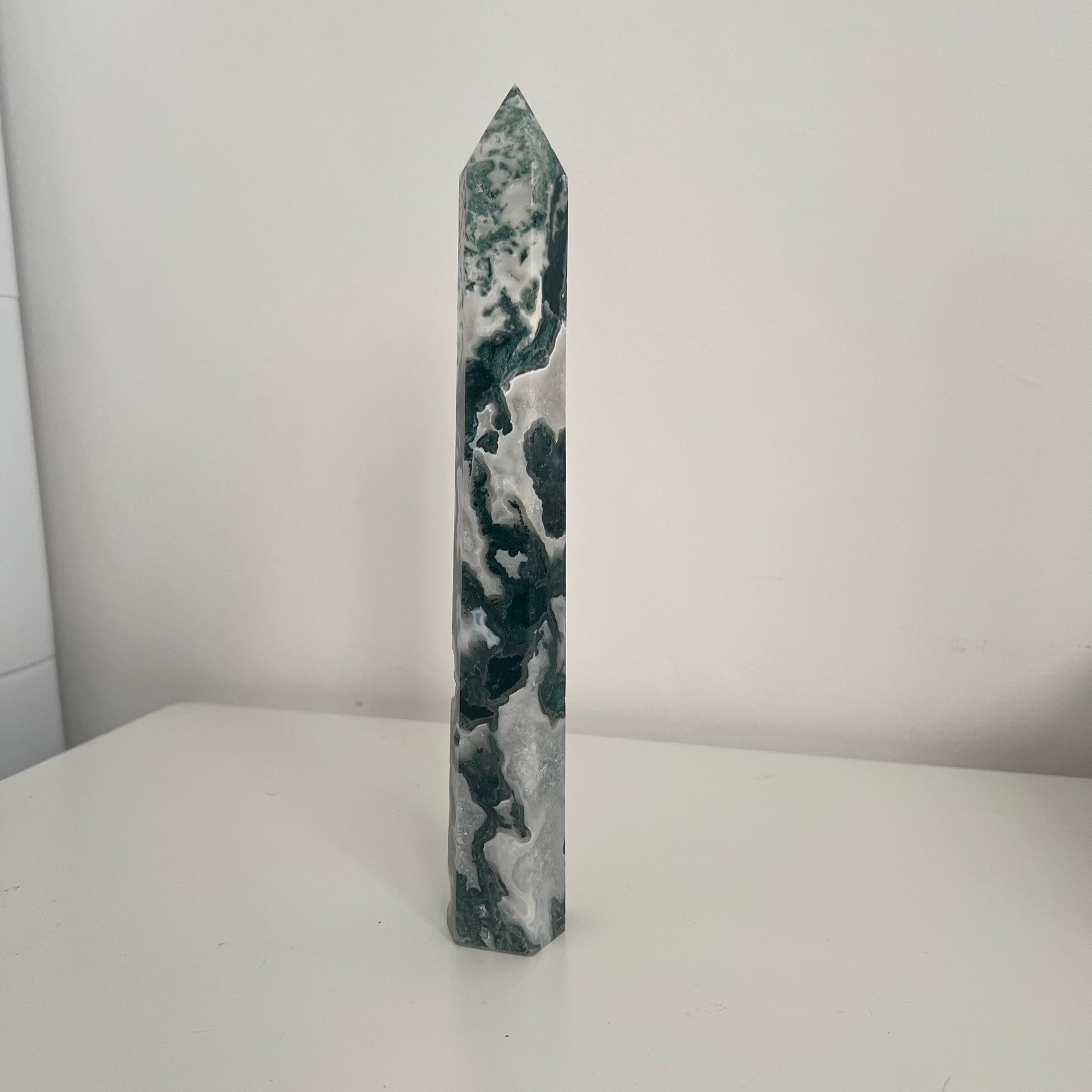 This beautiful 500g piece stands at 25cm tall, showcasing rich green moss-like inclusions flowing through milky white and translucent agate. The height and natural patterning make it an elegant display piece, with unique formations that ensure no two towers are ever the same. A calming, earthy addition to any crystal or décor collection.