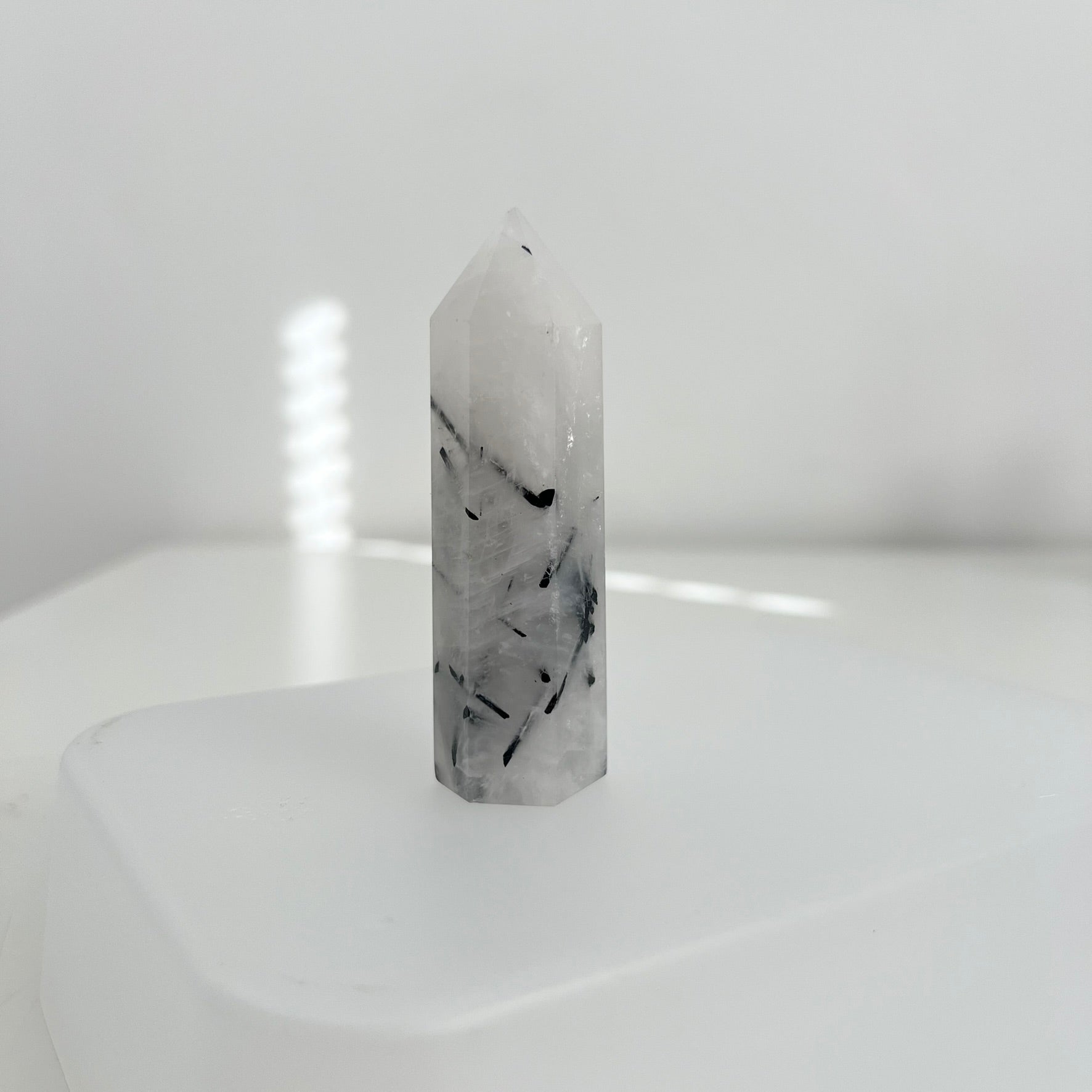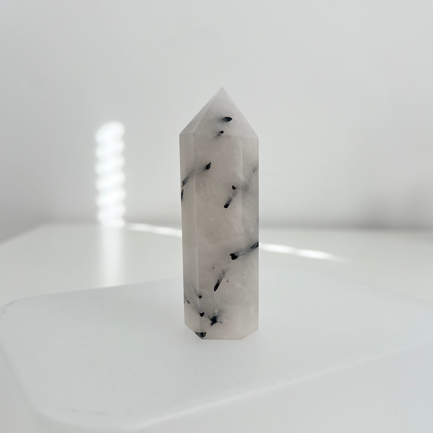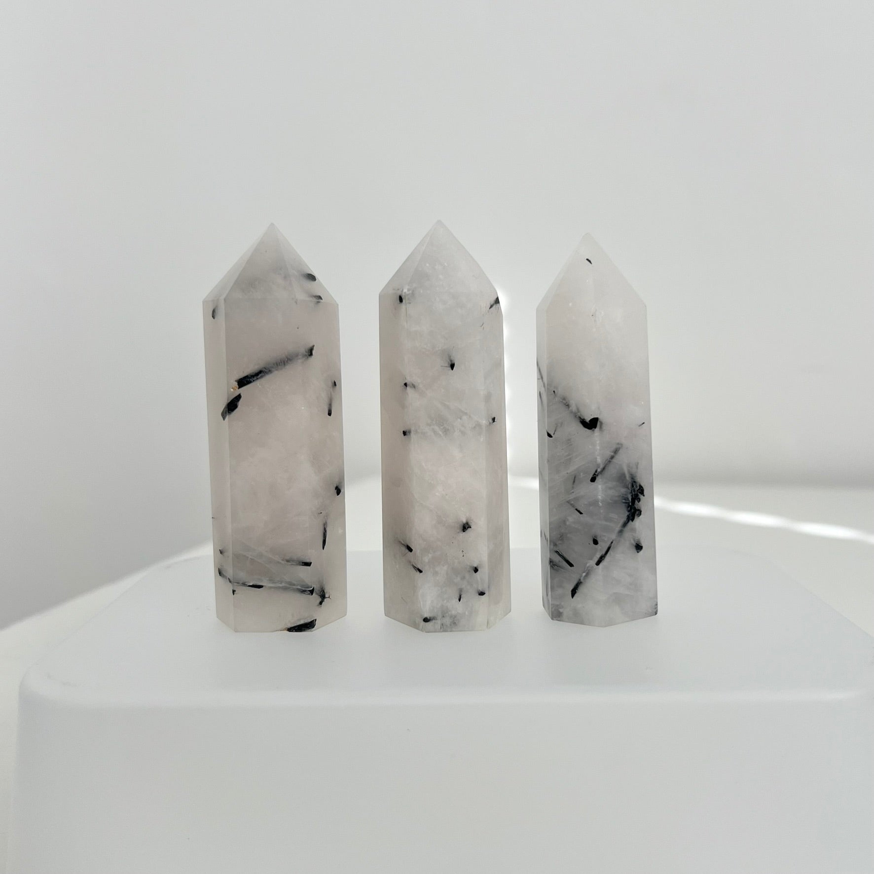 Polished quartz towers with striking black tourmaline inclusions. Each piece is unique, combining quartz’s clarity with tourmaline’s grounding energy. Perfect for décor, meditation, or crystal collections.