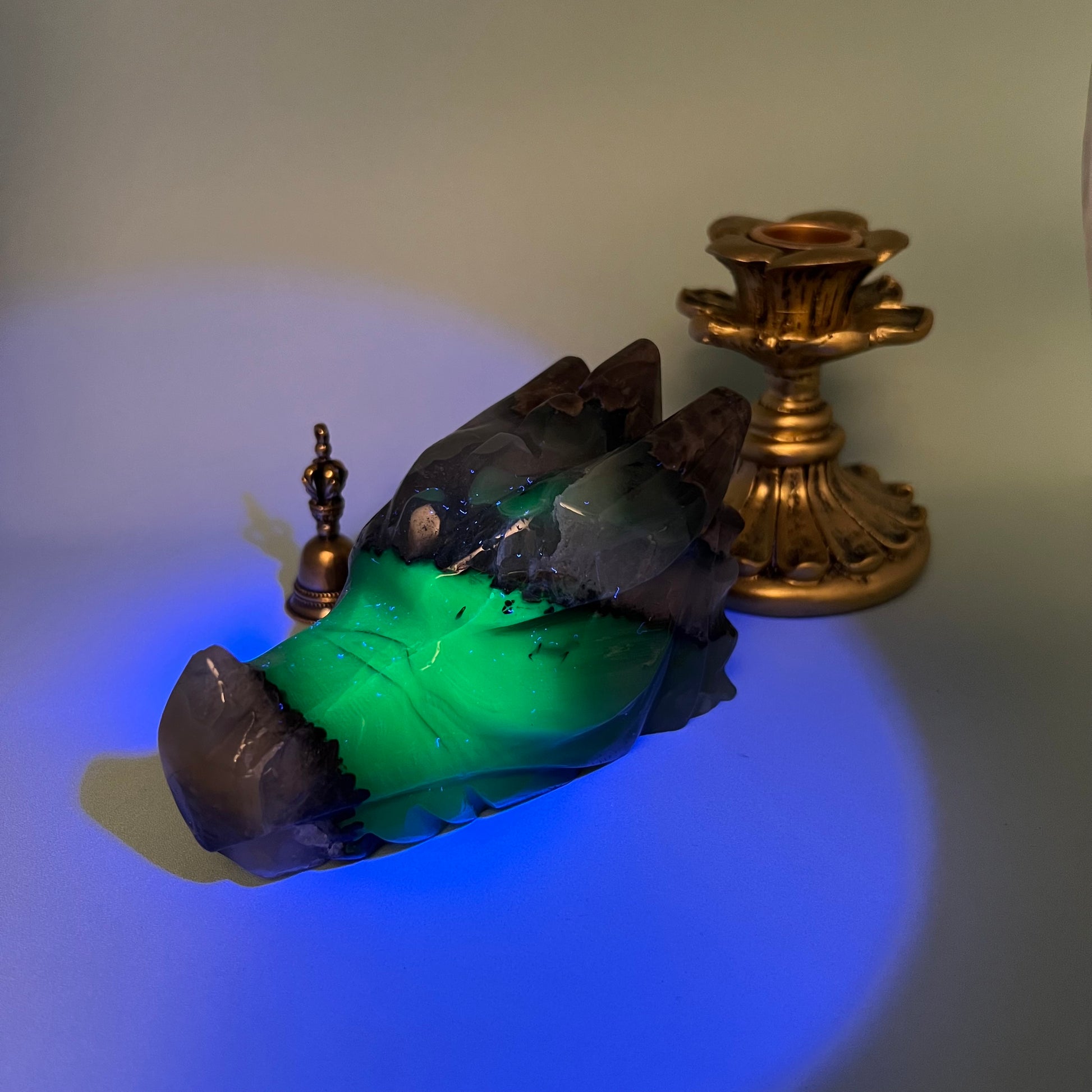 A bold dragon head carving made from natural volcano agate. Each piece features striking patterns and earthy tones created by volcanic mineral formations. The detailed carving and unique banding make this a powerful statement piece for any collection.